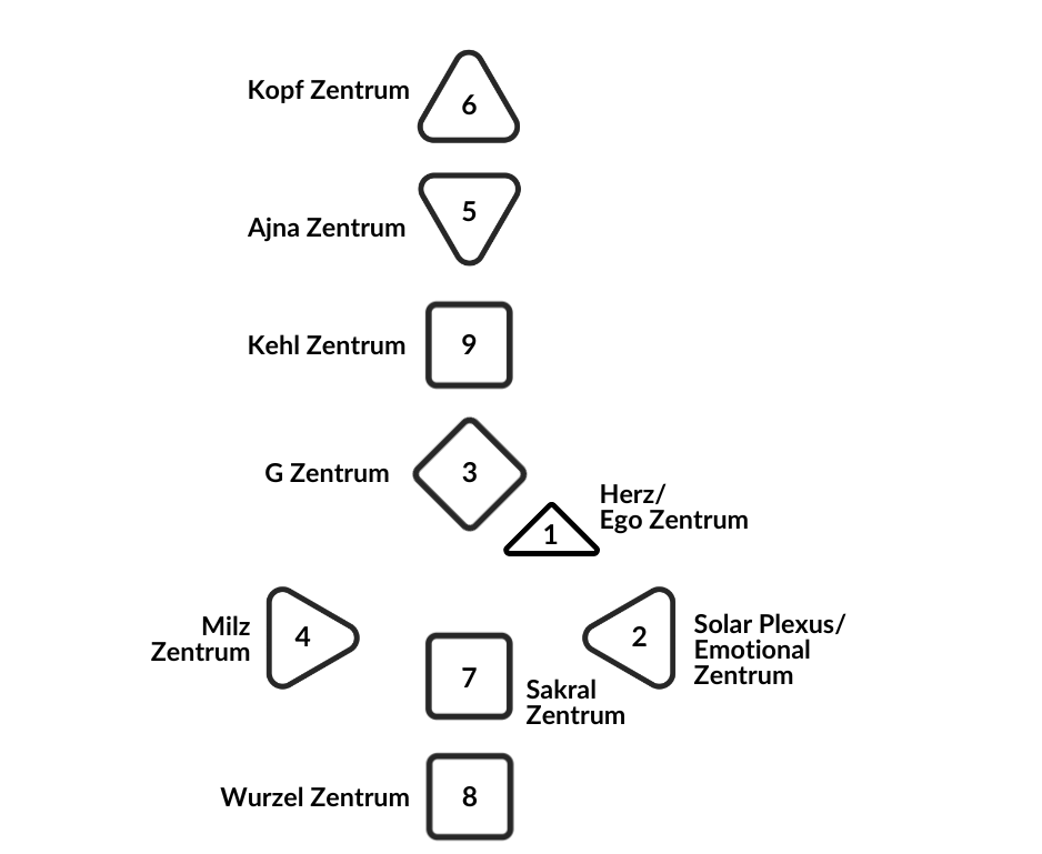 Wenn Du Dir Dein kostenloses Human Design Chart erstellt hast, dann sind Dir sicherlich die neun Quadrate und Dreiecke innerhalb der Körpergrafik aufgefallen. Aus dem Yoga kennst Du wahrscheinlich bereits die sieben Chakren. Das Human Design System (HDS) synthetisiert unter anderem Teile des jahrtausende alten Wissen der hinduistischen Chakrenlehre, jedoch sprechen wir hier von Zentren und arbeiten darüber hinaus mit 9 statt 7 Zentren, da das HDS davon ausgeht, dass es vor nicht ganz 250 Jahren ein ‘Update’ des Menschen gegeben hat, welches uns von einem 7-zentrigen Wesen zu einem 9-zentrigen Wesen hat mutieren lassen. Ob Zentrum oder Chakra, gemeint sind damit Hauptenergiezentren in unserem Körper, welche sich auf biologischer Ebene mit unseren wichtigsten Drüsen und Organen in Verbindung bringen lassen (Zirbeldrüse, Hypothalamus, Hirnanhangsdrüse, Schilddrüse, Bauchspeicheldrüse, Lungen, Haut, enterisches Nervensystem, Blase, Prostata, Niere, Nebennieren, Lymphsystem, Milz, Leber, Blut, Magen, Herz, Gallenblase, Thymusdrüse, Eierstöcke, Hoden). Daher finden sich auch oft Korrelationen zwischen körperlichen Beschwerden und energetischen Blockaden in den jeweiligen Zentren.