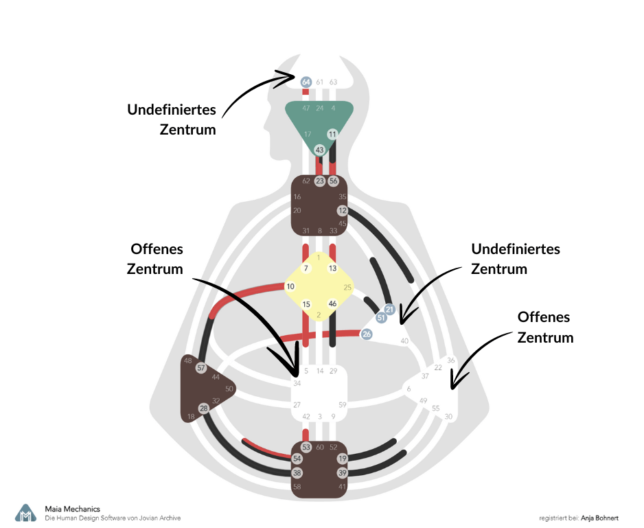 Im Folgenden erkläre ich Dir die möglichen Nicht-Selbst-Strategien jedes undefinierten (weißen) Zentrums und außerdem auch, wie sich diese zeigen, wenn ein Zentrum komplett offen ist, sich also keine einzige Tor-Aktivierung (schwarze oder rote Stiche) darin befindet.